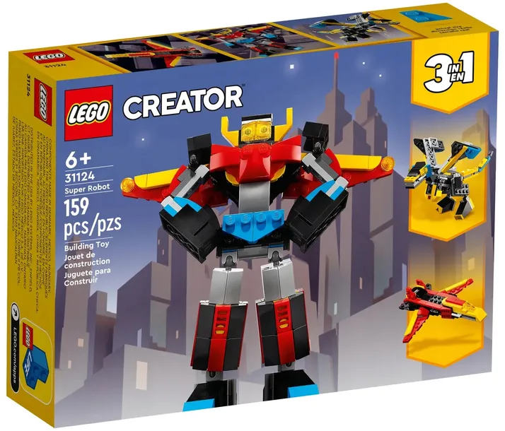 - Trzy zabawki w jednej — zestaw konstrukcyjny Super Robot (31124) pozwala dzieciom zbudować trzy kreatywne modele: robota, smoka i odrzutowiec